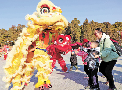 河南南阳卧龙岗文化园内,市民在欣赏舞狮表演。 高 嵩摄(新华社发)