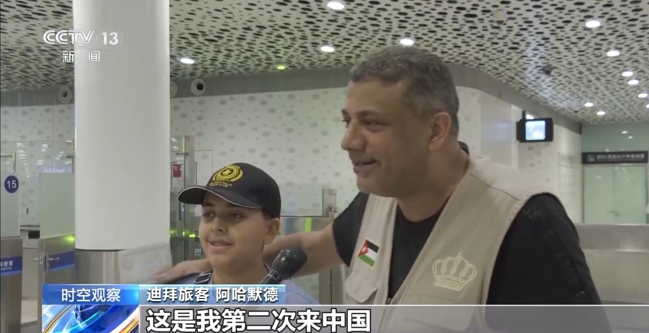 深圳边检总站深圳机场边检站执勤队副队长 郑正祥:一个很明显的变化是来华家庭游持续升温,特别是14岁以下儿童和65岁以上年长者这一人群,人员数量同比增长超43.4%。在口岸现场,我们也为60岁(含)以上的人员开通了特别通道,保障快速通关。 另一方面,航线网络的丰富,也为越来越多国家的家庭提供了便捷的出游选择。今年暑期,深圳机场加密了深圳至迪拜,新开深圳至马累、暹粒等多条航线,往来阿联酋的出入境人员同比增长160.8%,美国、西班牙、英国、法国四国的入境外国人同比增长超37.1%。 这对来自迪拜的父子告诉记者,他们现在来中国非常方便,所以特意带着孩子来中国玩。