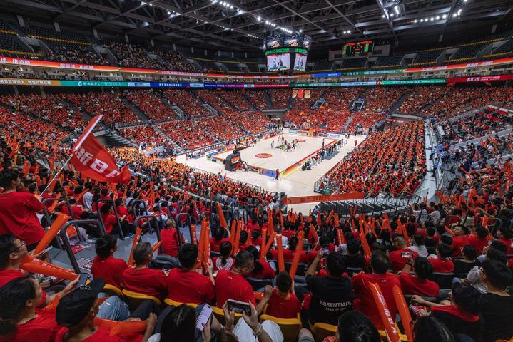 浙江省城市篮球联赛(浙“BA”)绍兴市预选赛决赛现场(7月19日摄)。新华社发(郭斌 摄) 在杭州临平体育中心,球馆内,球队激战如火如荼;球馆外,“浙BA夏日晚风集”汇聚地方美食等特色摊位,为球迷提供多样的消费选择。“球赛电子票还叠加了西湖游船折扣、武林夜市满减等优惠,从外地来看比赛正好顺道畅游杭州。”球迷韩涛说。